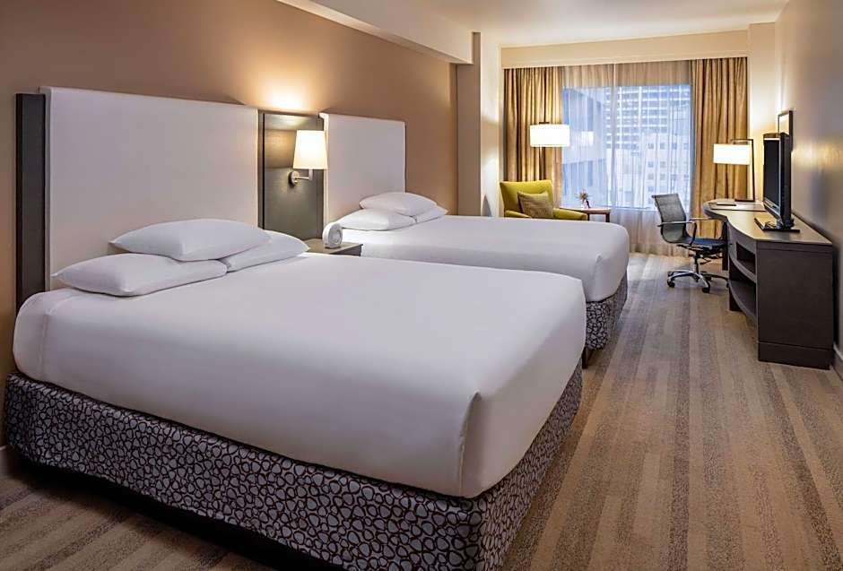 This Deluxe Queen room features plush pillows, down blankets, and 2 queen pillow top mattresses. A satellite TV, and an in-room coffee and tea maker is offered. The private bathroom includes a glass walk-in shower and Portico bath products.